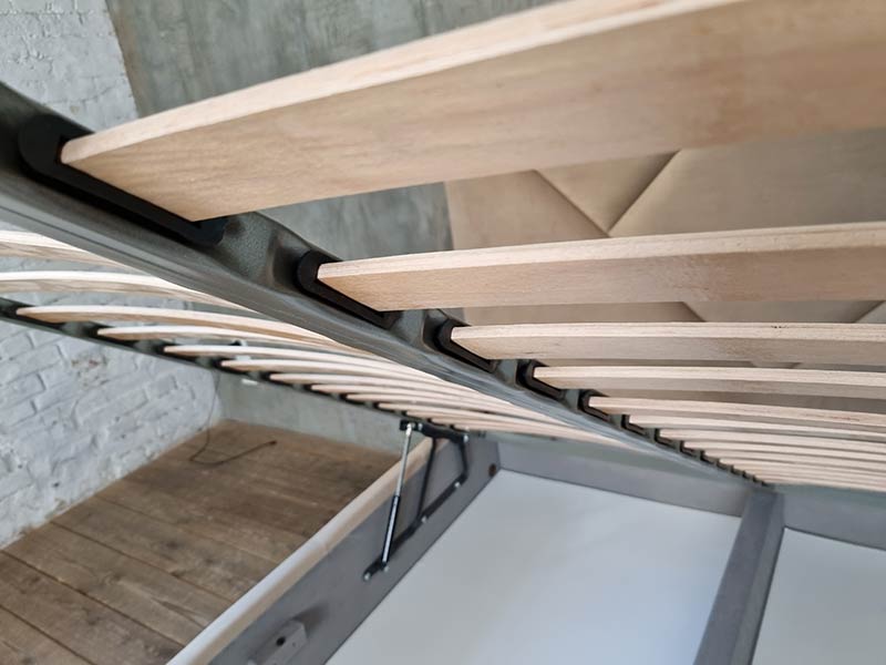 При виборі комплектації з підйомним механізмом ліжко матиме міцний металевий каркас, з'єднаний широкими ламелями, що запобігає їх випаданню.