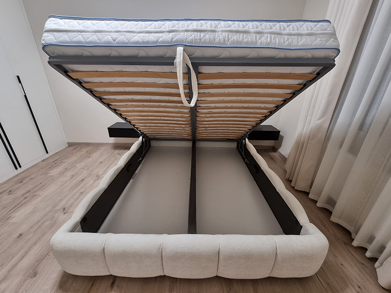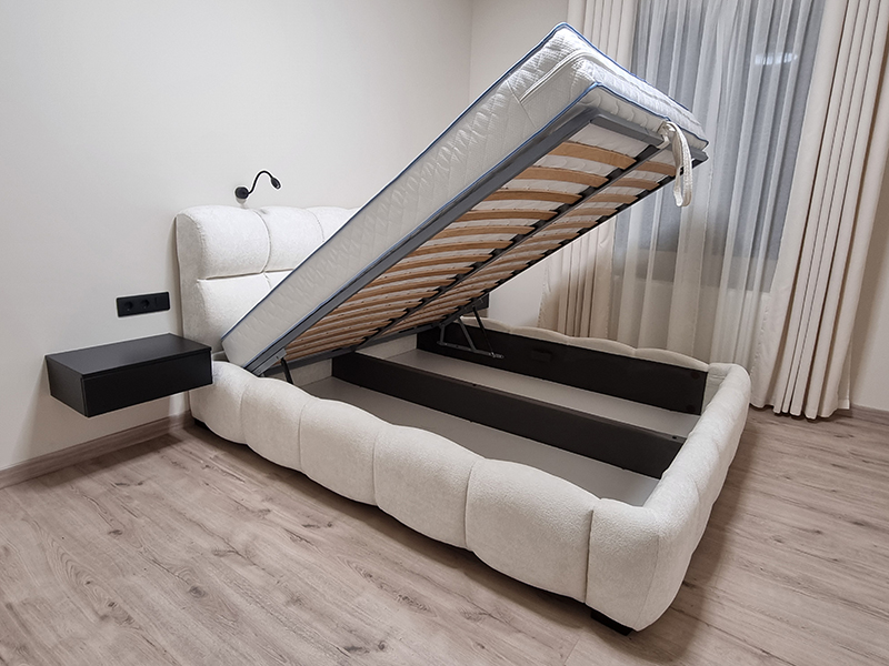 У комплектації з підйомним механізмом ліжко оснащене глибоким коробом для зберігання білизни, що дозволяє використовувати простір під ліжком як додаткову шафу для зберігання.